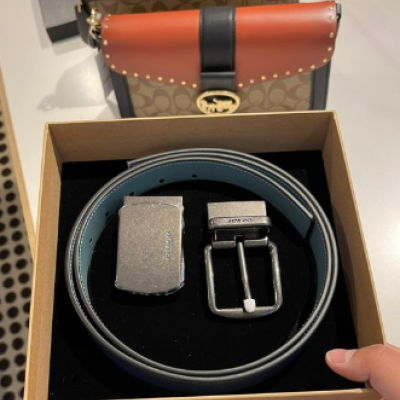 【清仓】Coach 新款男士皮带礼盒套装🎁🎁皮带尺寸(不算金属头)可自裁 :长120cm,宽3.8cm,最小洞长108cm,最大洞长120cm 。腰带头都可以旋转,正反两面颜色使用~还配有礼盒,无论是自用还是送人都挺合适。性价比很高