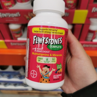Bayer 儿童多种维生素咀嚼片220粒儿科医生的推荐, 妈咪的首选, 宝宝的最爱! 小小的一片味道甜美的咀嚼片含有包括维生素A、C、D在内的10种最基本和最精华的婴幼儿日常所需的维生素卡通形象,口味酸甜的水果味,即使再挑食的小朋友也会喜欢吃!新配方,特别含有复合维生素B,有益于大脑健康发育。可爱的形状,小朋友的最爱。把儿童成长中要补充的各种维生素和矿物元素做成好玩的摩登原始人造型,配上天然的果味,深受儿童喜爱。纯水果中提取,不含人工香料、色素和添加剂,可以放心给孩子服用。